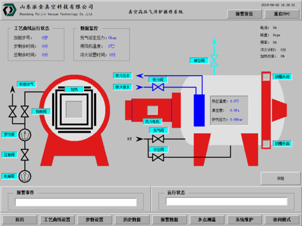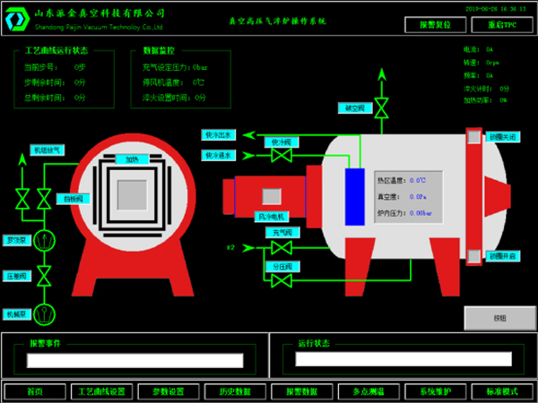 隨著越來越多真空熱處理設備的廣泛應用,如何通過設備來提高工作效率已經是眾多熱處理企業追求的問題,本系統是派金獨立研發出第六代操作系統,具有完全自主知識產權;性能穩定;自動化程度高;故障率低;易操作等特點。第六代操作系統在原有基礎上增加了變頻通訊(轉速自動調整/手動調整),等溫淬火,淬火預冷;曲線記錄以及打印等適應眾多新型工藝的功能,最大程度滿足客戶工藝要求,并開發出夜間與白天模式自由切換,避免夜晚觀察出錯,新增加恢復出廠設置功能,即使參數錯亂,即可一鍵恢復。